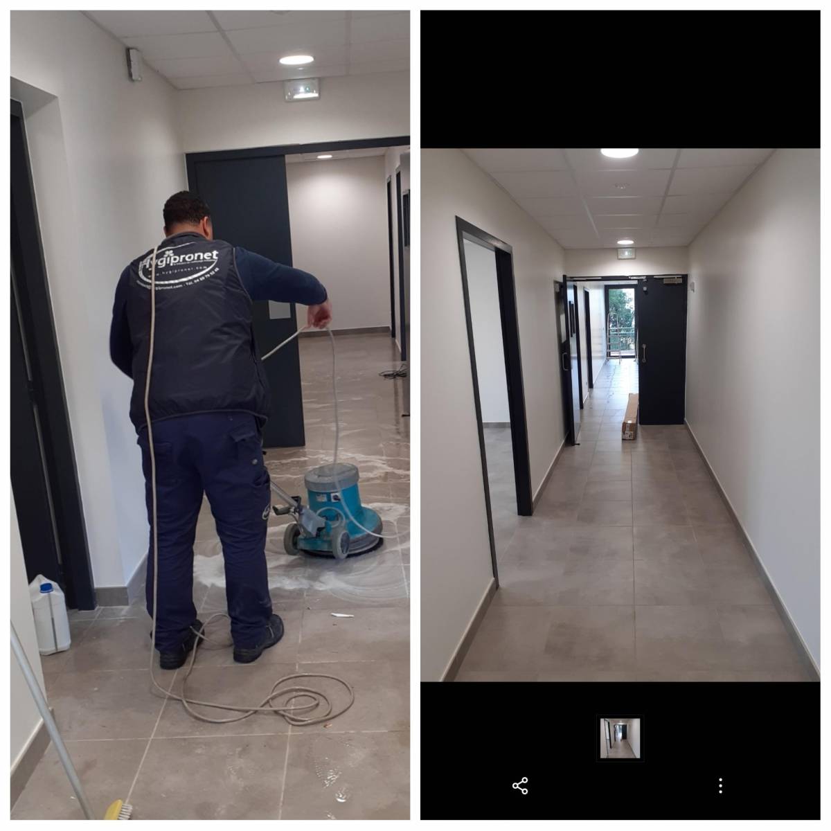 remise en état, après travaux de rénovation, nous avons commencé par un grand dépoussiérage, allant du sol au plafond. Puis, pendant qu'un de nos agents d'entretien s'est affairé au nettoyage des sanitaires, faïence murale comprise, un autre s'est équipé d'une monobrosse, afin de