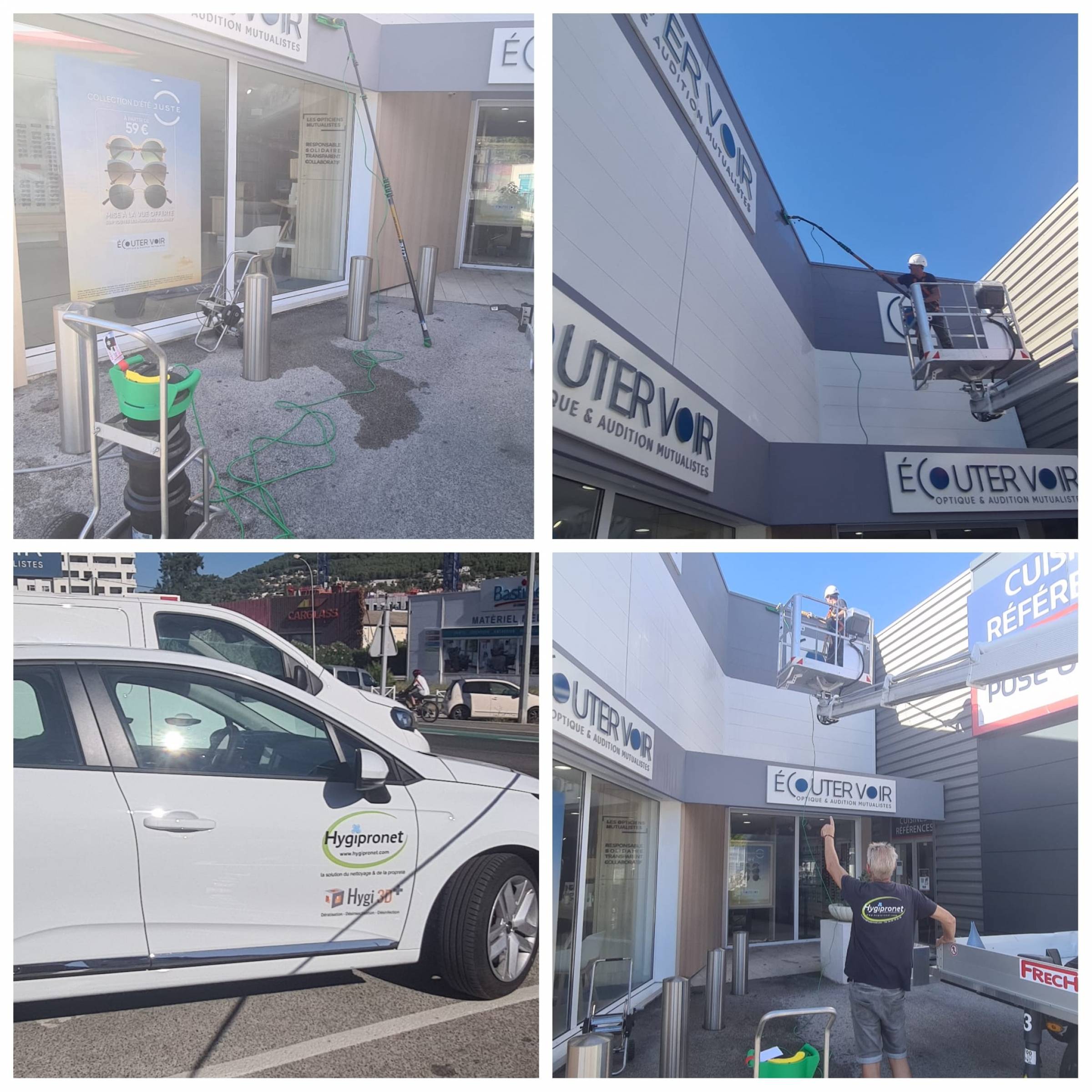 Nettoyage du bardage avec nacelle :Nettoyage des vitres et de l'enseigne à la perche, à cause du débord de la toiture, pour la